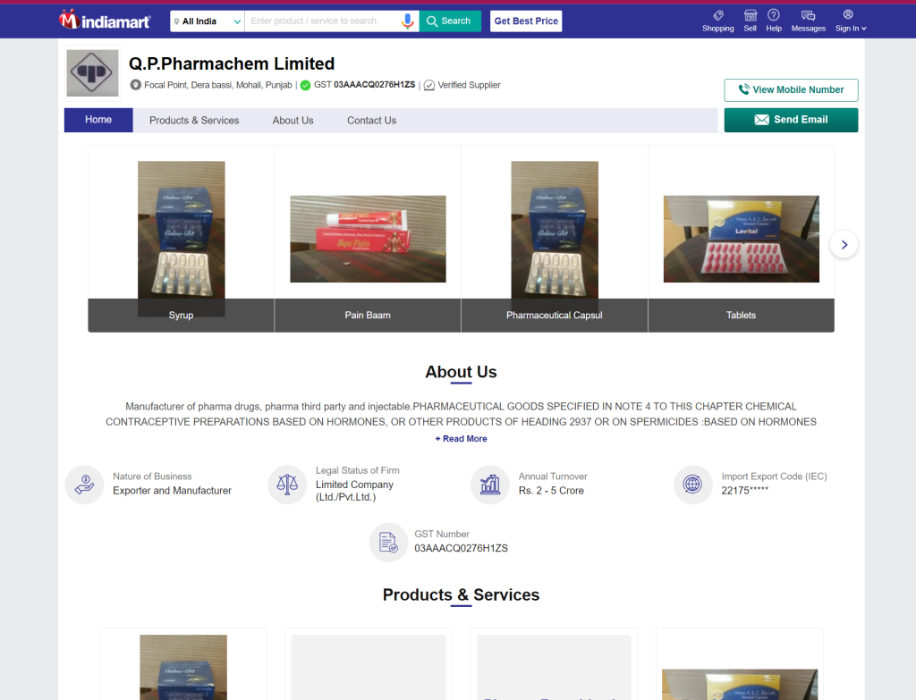 IndiaMART even ranks QP Pharmachem is a Verified Supplier, despite the company being implicated in producing tainted medications that triggered a World Health Organization (WHO) alert and losing their license. This raises serious questions about IndiaMART’s verification process and its impact on global health.